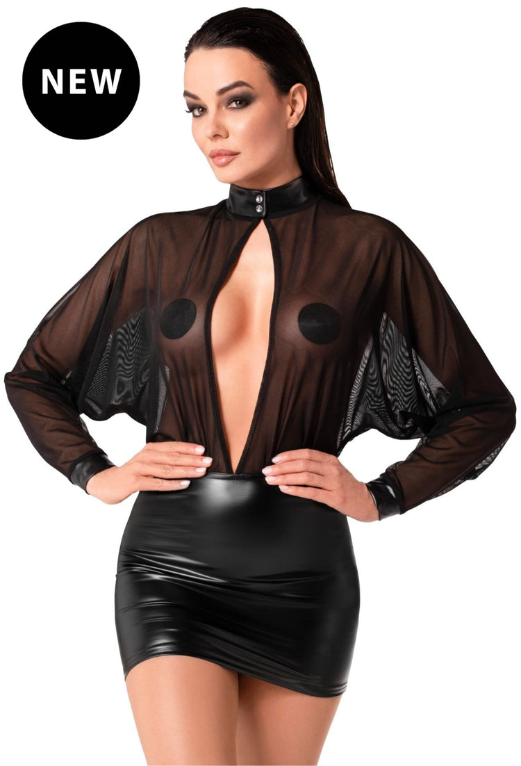 This captivating ensemble combines the elegance of sheer mesh with the boldness of Stretchy Power Wetlook fabric, creating a look that’s both daring and sophisticated. Perfect for those who love to make a statement, this outfit is designed to turn heads and leave a lasting impression.