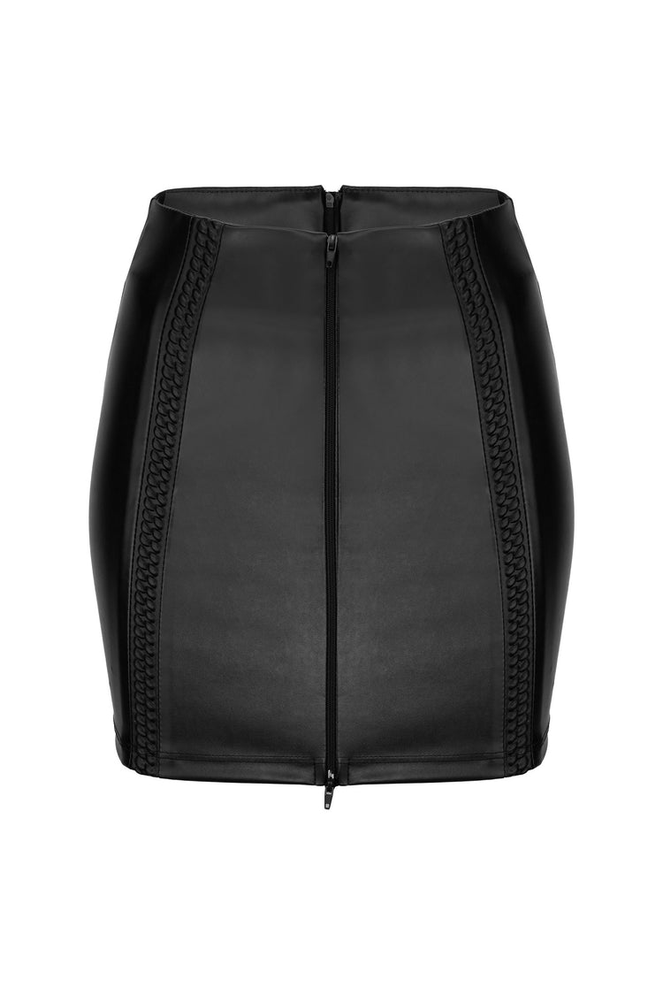 Tasteful eco-leather skirt with tape and a 2-way zipper in the front + zipper at the rear. High waist style accentuates feminine curves.